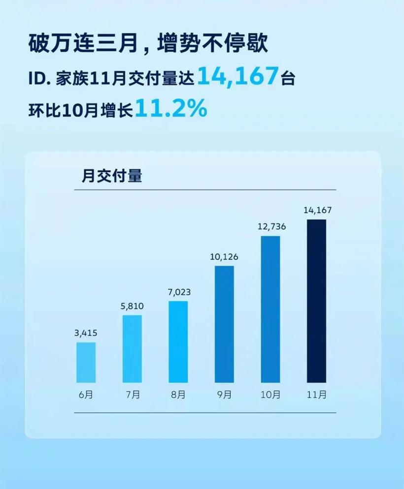 ID.家族的市场潜力也在产品线的补强中不断释放,月销量在9月顺利突破万辆水平,在10月更是达到12,726辆,11月仍延续这一水平,交付量达到14,167辆,累计交付量约5.7万 辆。而这一切还是在缺芯、产能受限等不利条件下,市场自然选择的结果。