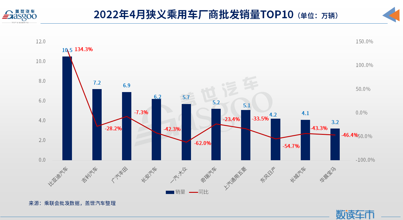 伴随4月狭义乘用车产销量降至历年来最低点,4月狭义乘用车厂商批发销量前十的车企与之前相比也出现了较大变化,其中变化最明显的是比亚迪首次登上榜首,合资车企整体承压条件下华晨宝马“意外”入榜。