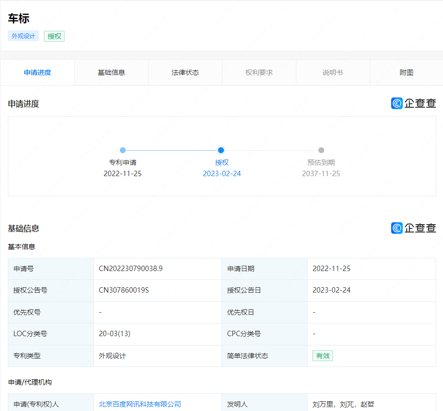 2月24日,据企查查显示,北京百度网讯科技有限公司申请的“车标”外观专利获得授权。