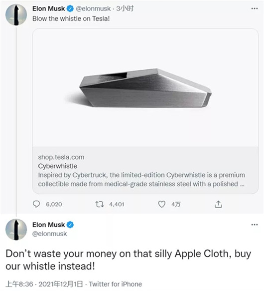 “不要在愚蠢的苹果抛光布上花钱,快来买特斯拉哨子吧!”
