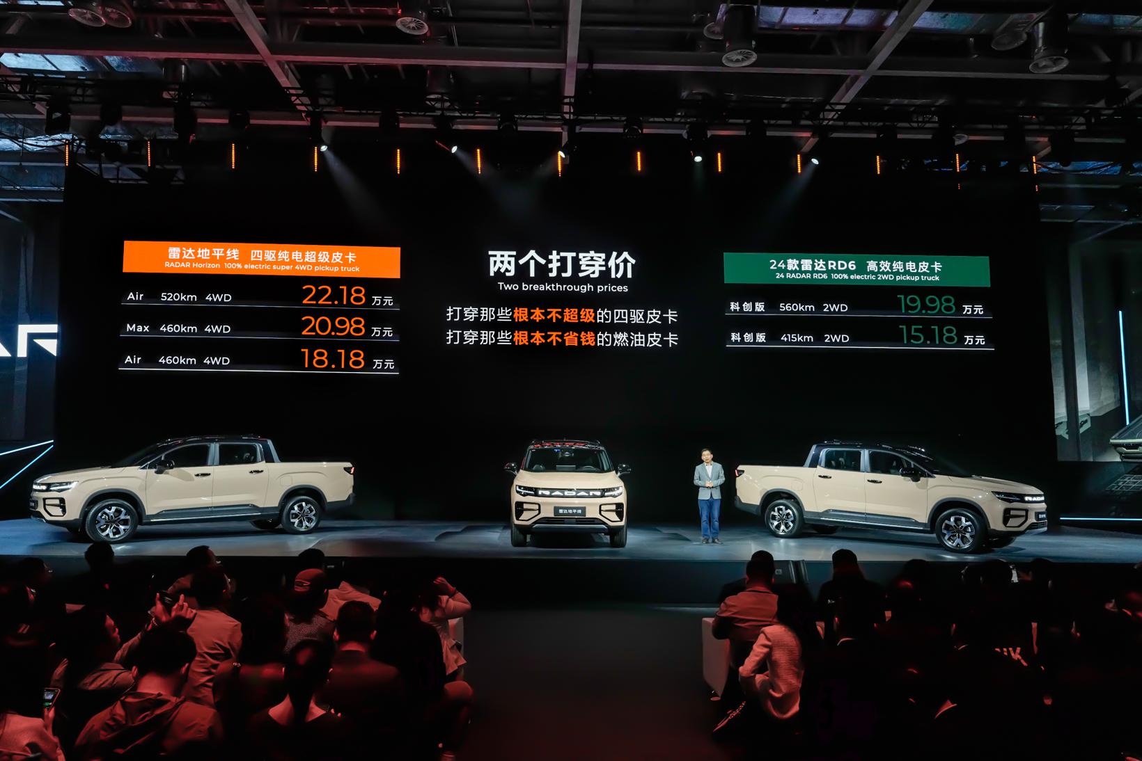 4月23日,吉利雷达上市新产品雷达地平线,并推出两个打穿价:地平线AIR 460km版售价18.18万元,MAX 460km版售价20.98万元,AIR 520km版售价22.18万元;RD620两款新车售价15.18万元与19.98万元。这样的极致的售价,也势必在皮卡市场开启“电比油低,电比油好”的新时代。